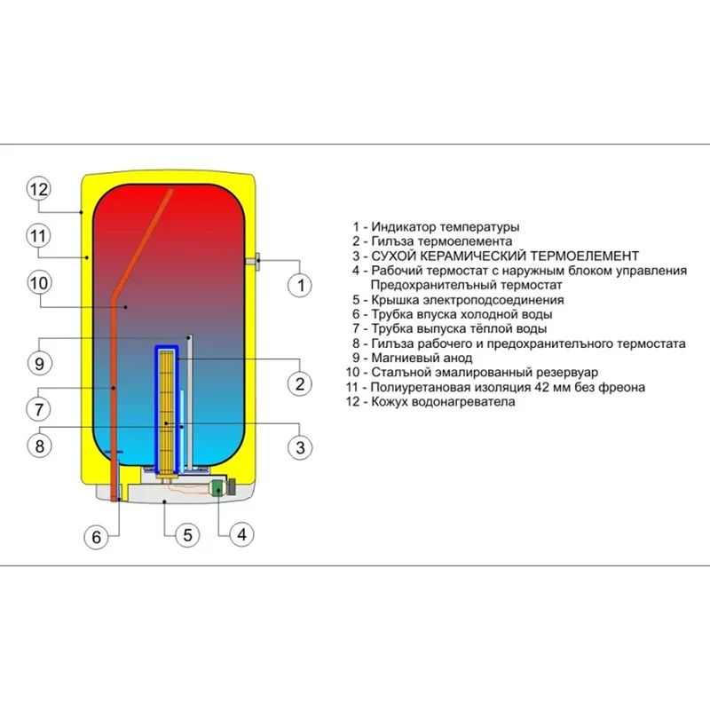 - Нагревание осуществляется посредством керамического нагревательного элемента, управляемого рабочим термостатом и защищенного предохранительным термостатом (тепловым предохранителем)