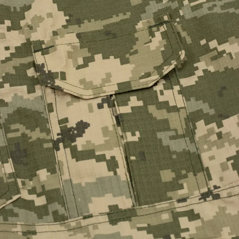 Матеріал штанів — тканина Ripstop. Це міцна сучасна тканина, яка виробляється за спеціальної технологією. В основне полотно вплітається підсилююча армована нитка, утворюючі квадратний візерунок. Розмір квадратів приблизно 5х5 мм. За рахунок зміцнюючих ниток дрібні порізи і дірки не можуть вільно розійтися на такій тканині. Тканина стає міцнішою до механічних пошкоджень, та краще переносить польові умови використання.