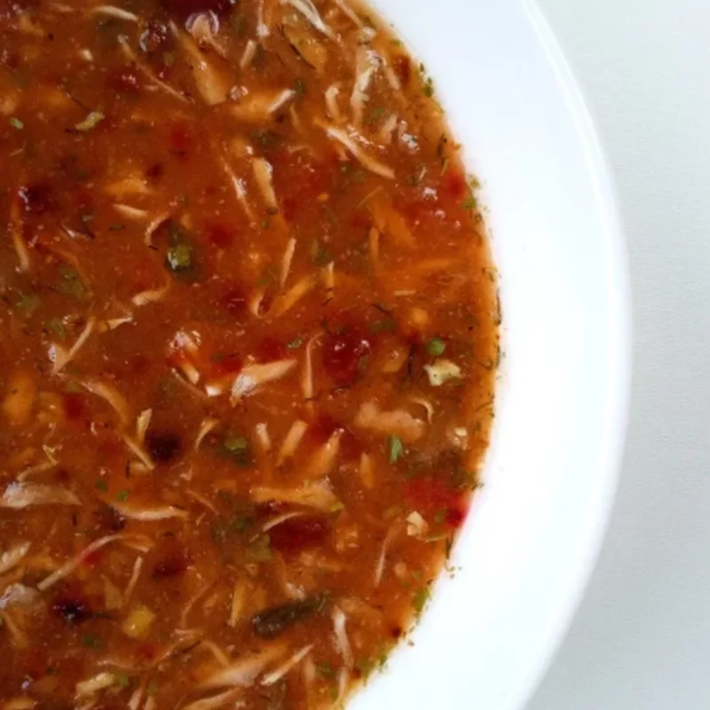 Склад: варено-сушена курка (15%), картопляні пластівці, капуста, морква, цибуля смажена, буряк, томат різаний, гарбуз, томат мелений, паприка мелена, часник, цибуля-порей, петрушка, лавровий лист мелений, сіль, перець.