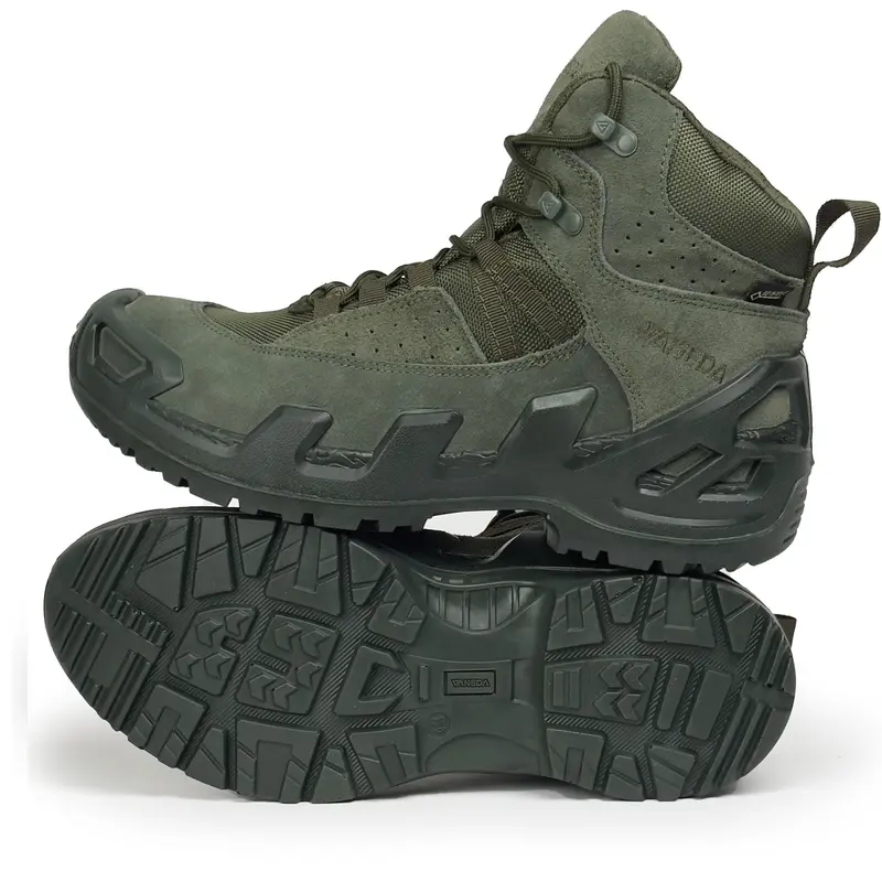 Ботинки тактические Vaneda V-Clutch Pro DRY-TEX олива - высококачественная модель для военных, сотрудников силовых и охранных структур. Также ботинки подойдут людям, которые ведут активный образ жизни. Верх - комбинированный, выполненный из прочной нубуковой кожи. Она обладает высокой воздухопроницаемостью, но одновременно защищает от попадания влаги внутрь. Нубук дополнен прочной тканью CORDURA. Благодаря такой конструкции облегчается вес обуви, что хорошо влияет на комфорт ношения. Подкладка обуви - дышащая, выполнена из качественного полиэстера. Отдельно стоит упомянуть о 100% водонепроницаемой, дышащей мембране DryTex. Она эффективно отводит испарения тела, поддерживая этим естественный теплообмен. Таким образом, даже при длительном активном ношении, ноги будут в максимальном комфорте. Метод крепления подошвы - литьевой. Глубокий протектор обеспечивает высокую цепкость на различных типах поверхности - асфальт, камни, грунт, трава, песок и тому подобное. Нижняя часть подошвы изготовлена из резины NUBES I-RUBBER, что имеет высокие антискользящие свойства. Ботинки защищены от износа наплывами подошвы в носке, боковых и задней части. Высокая шнуровка на петлях плотно фиксирует ботинки на ногах. В задней части горловины предусмотрена петля, позволяющая удобно обуваться без помощи ложки.