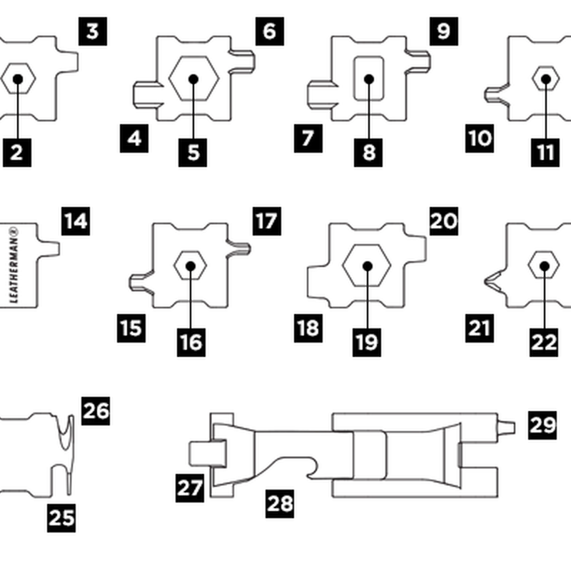 До» складу " Leatherman Tread входять викрутки з хрестовим і прямим наконечниками, шестигранники, викрутка Phillips, накидний ключ, інструмент для розбивання скла, різак, інструмент для вилучення SIM-карт і навіть вбудована відкривачка для пляшок.