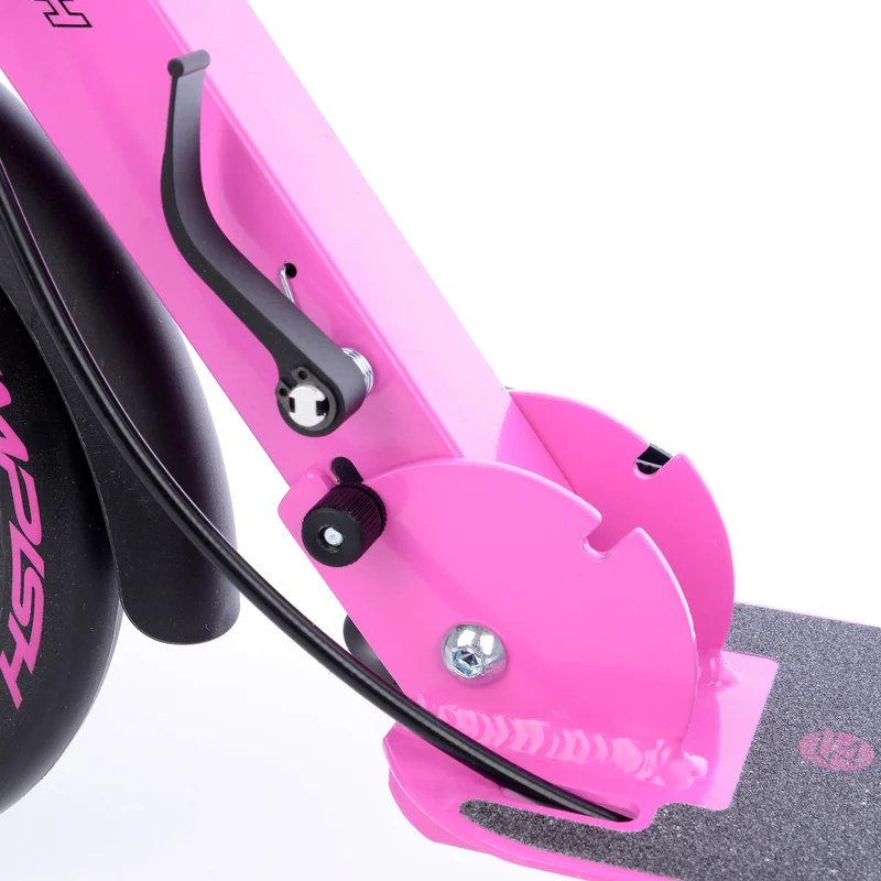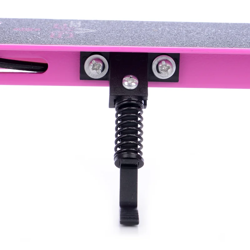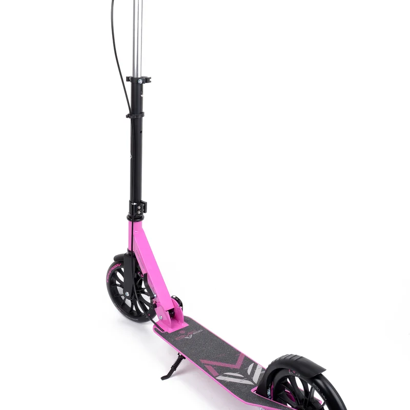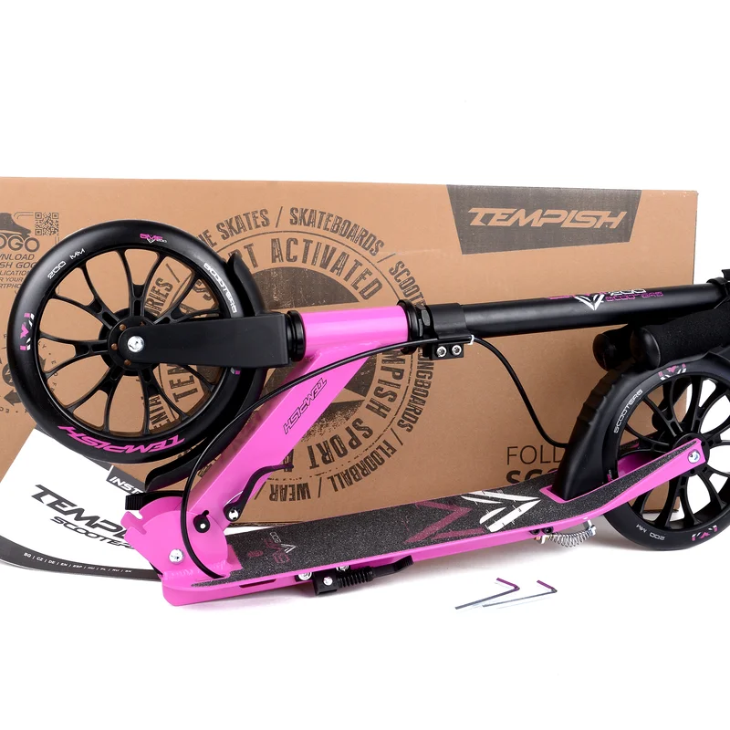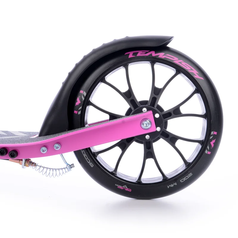Колеса диаметром 200 мм и шириной 30 мм изготовлены из прочного полиуретана, благодаря чему у них хорошее сцепление с дорожным покрытием, они хорошо сглаживают мелкие неровности и имеют длительный срок службы. Закрыты колеса небольшими крыльями, защищающими вас от брызг с мокрой дороги. Работают колеса на подшипниках класса точности ABEC 5. Это среднеуровневые подшипники, которые устанавливаются на большинство среднеклассовых самокатов, но лишь немного уступают по качеству более прецизионным. Для парковки модель оборудована складной подножкой.