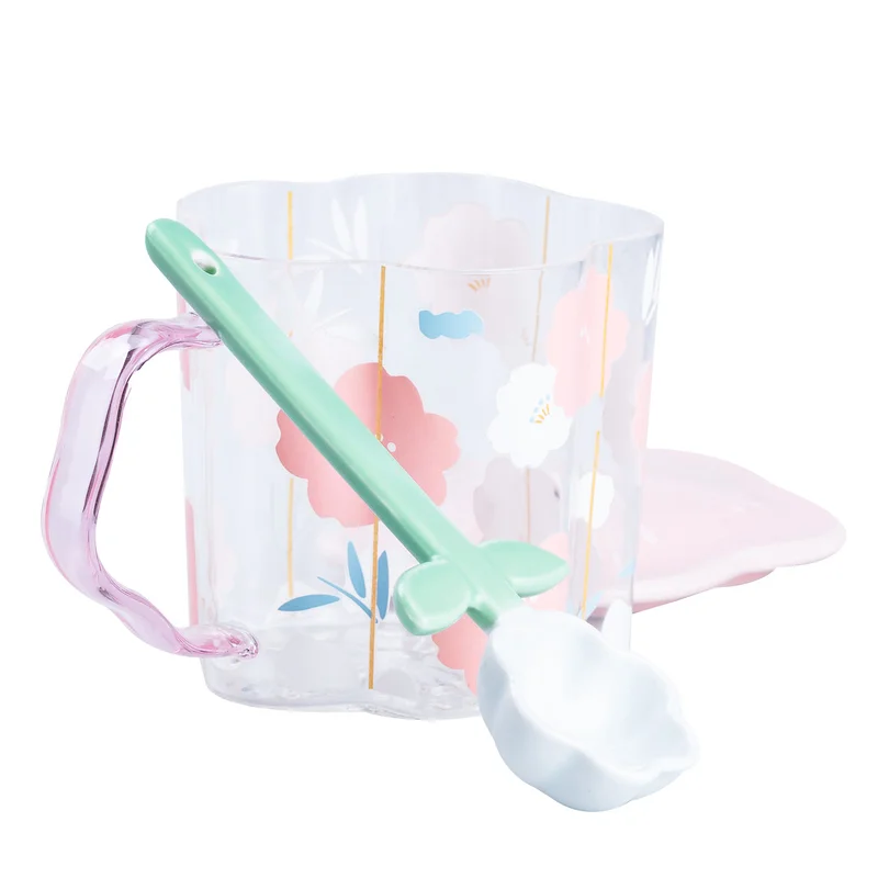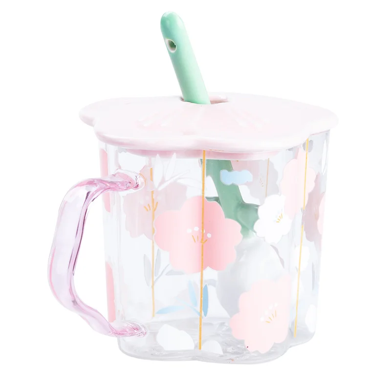 Чашка скляна 500 мл з ложкою та кришкою Рожевий