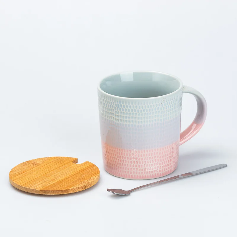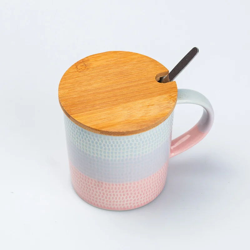 Чашка з бамбуковою кришкою та ложкою керамічна 350 мл Рожевий