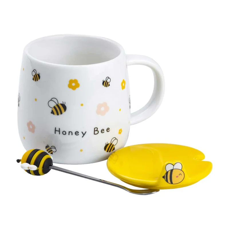 Чашка з кришкою та ложкою 450 мл керамічна "Бджілка" з жовтою крапочкою