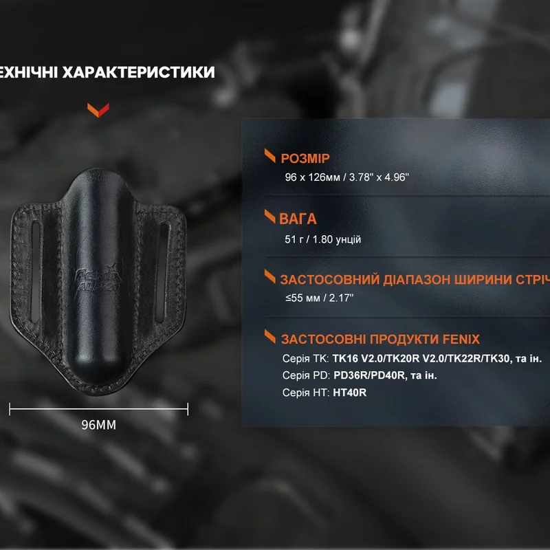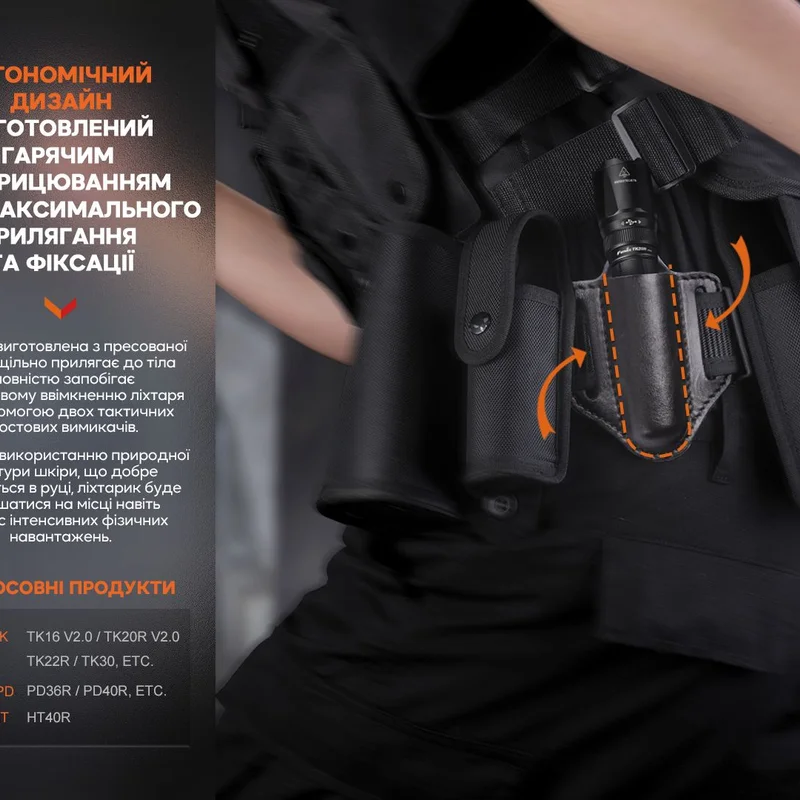 Фіксація освітлювального пристрою у вертикальному положенні робить експлуатацію зручною як для правші, так і для шульги, а відкритий дизайн дозволяє швидко дістати й використати ліхтар. Чохол підходить для кріплення на ремені завширшки ≤55 мм.
