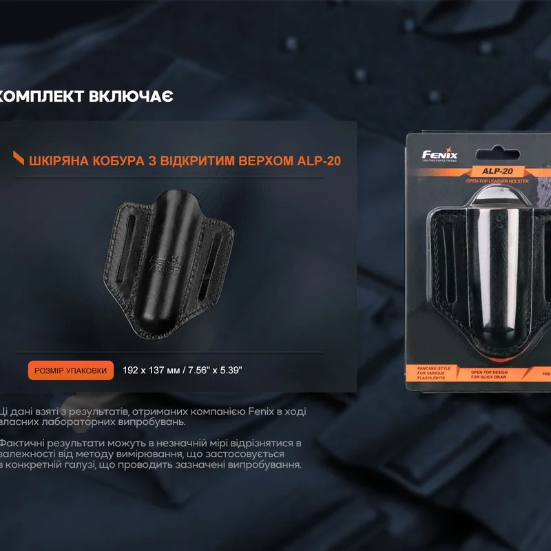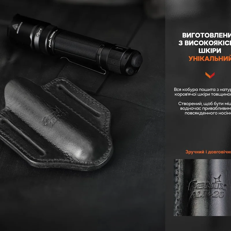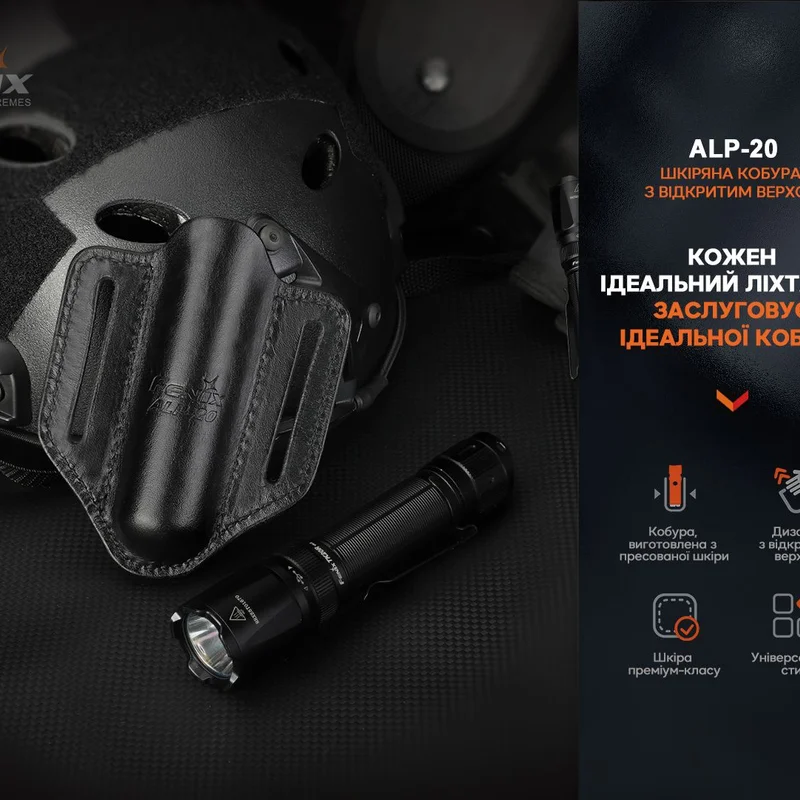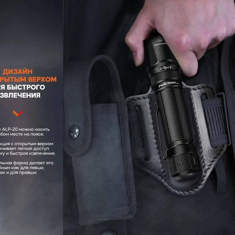 Чохол Fenix ALP-20 розроблений таким чином, щоб щільно утримувати ліхтар усередині, запобігаючи випадковому натисканню тактичних перемикачів у хвості або випаданню пристрою під час активного руху користувача.