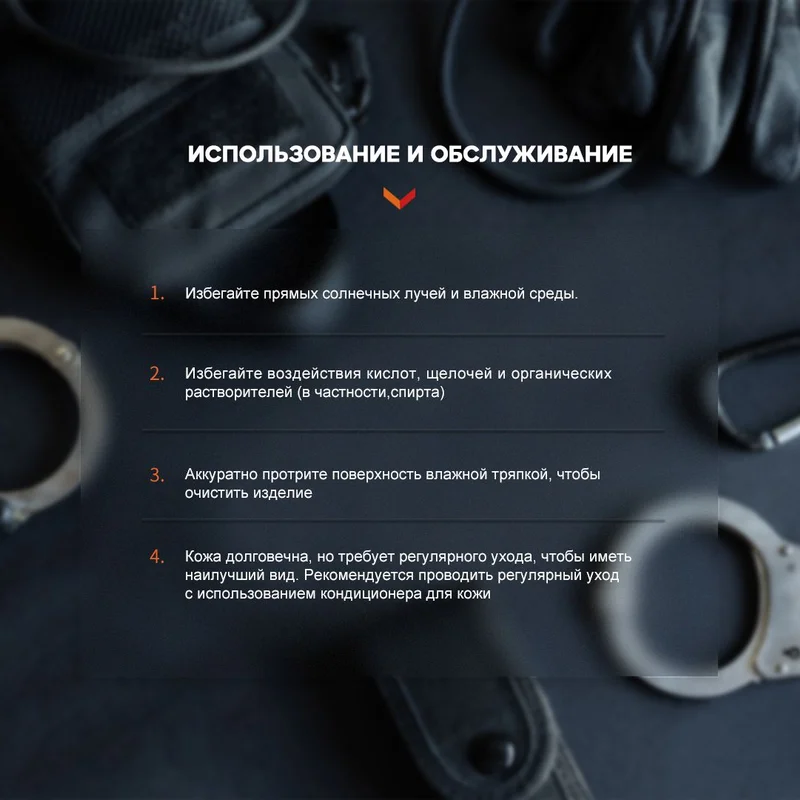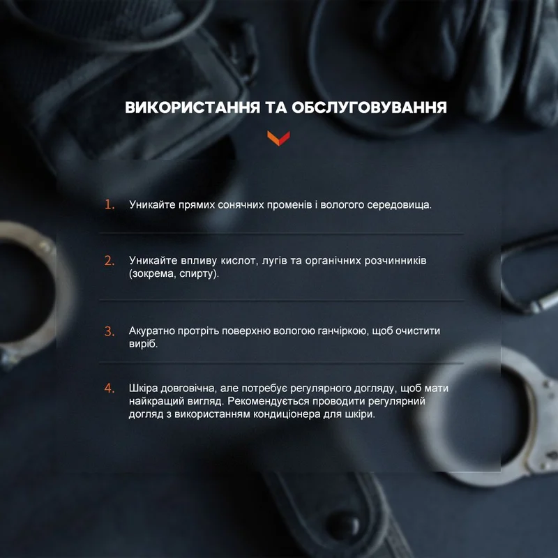 Для догляду за матеріалом рекомендується використовувати кондиціонер для шкіри. Для очищення достатньо протерти виріб чистою, злегка вологою ганчіркою.