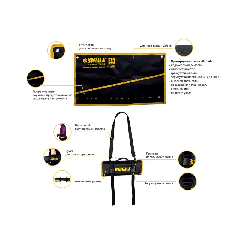 Чохол, має зручну ручку для перенесення набору, а також оснащений регульованим, знімним неоплачений ременем, має міцні пластикові замки і міцний тканинний матеріал (подвійна тканина Oxford з прогумованими кишенями, щільність 600D). Чохол зшитий добротно і якісно, все рядки виконані акуратно, нитки добре закріплені і не розпускаються. Кожен відсік має маркування (розмір гайкового ключа) для зручності в пошуку потрібного інструменту.