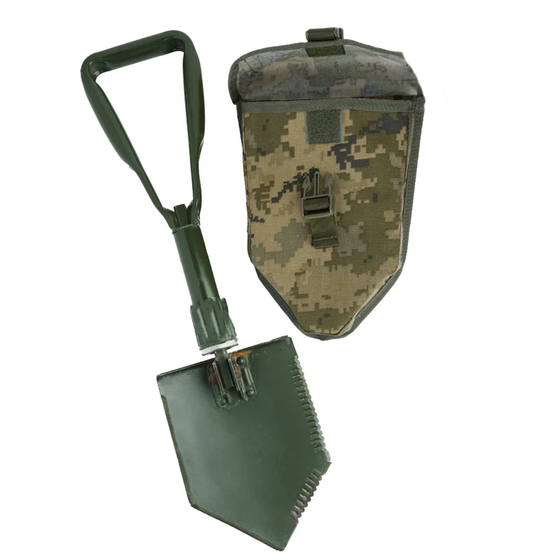 Складна лопата надійно фіксується в чохлі за допомогою липучки Velcro та застібки Fastex.