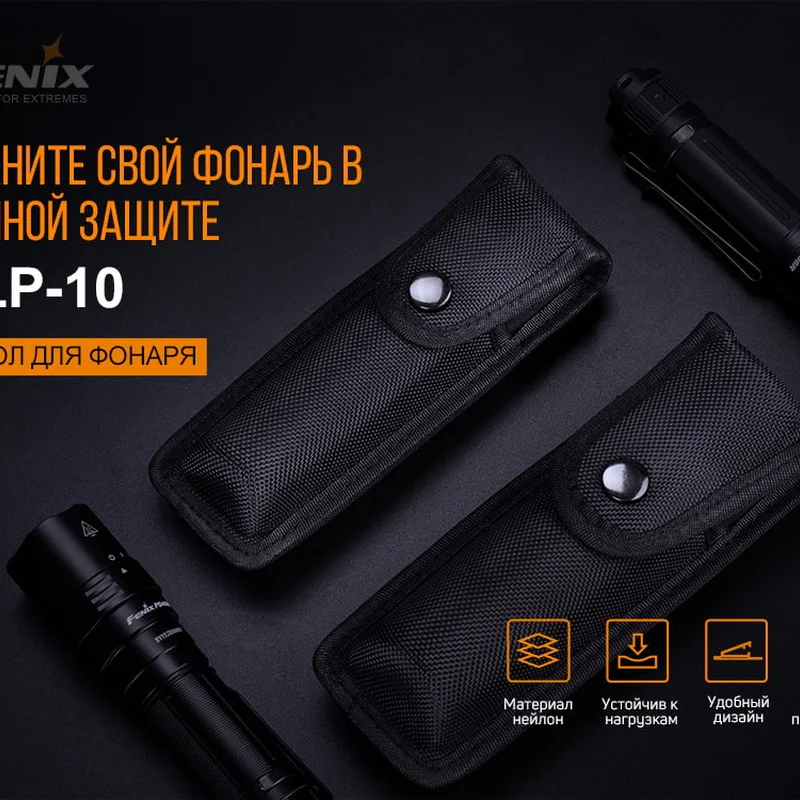 Модель Fenix ALP-10 являє собою жорстку кобуру для ліхтаря як великого, так і маленького розміру. Чохол зроблений з міцного нейлонового матеріалу, який надійно захищає освітлювальні прилади. Нейлон характеризується приголомшливим поєднанням якостей: він поєднує в собі міцність, стійкість до температур, до хімічних реагентів. А також – еластичність. Подібні властивості роблять його прекрасним вибором для виготовлення багатьох товарів. Особливо, якщо мова йде про використання виробу в цілях туризму і активного відпочинку.