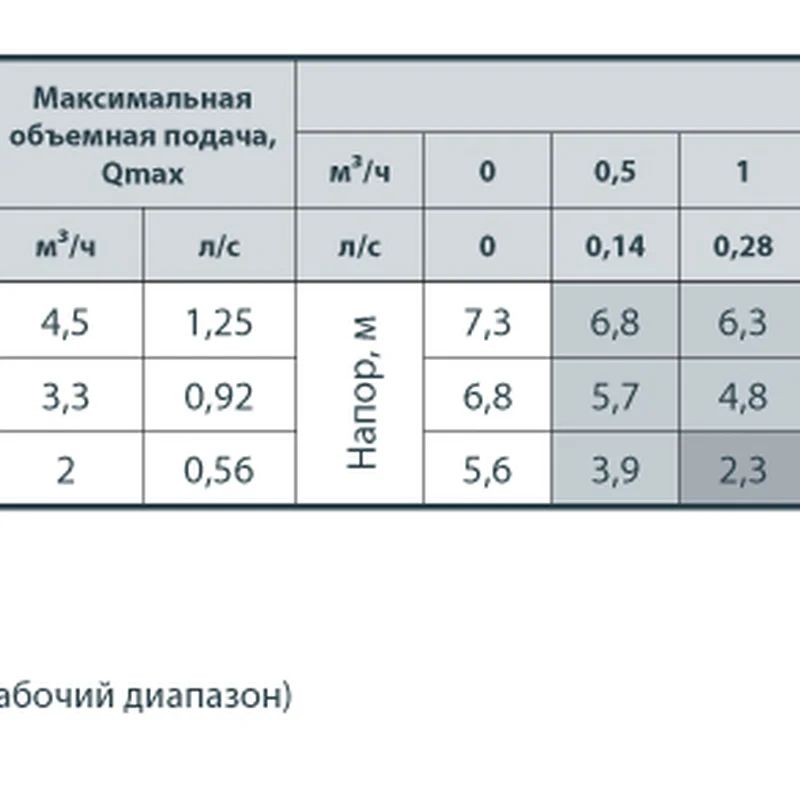 - Максимальная объемная подача: 4,5 м³/ч (1,25 л/с)