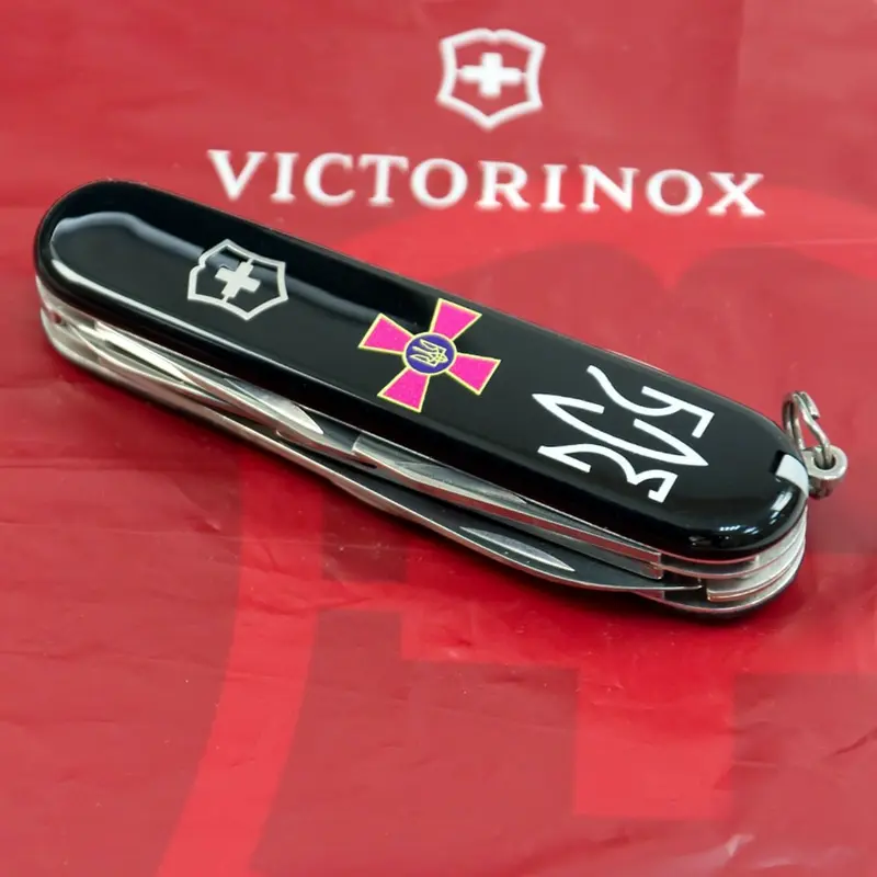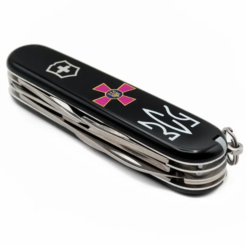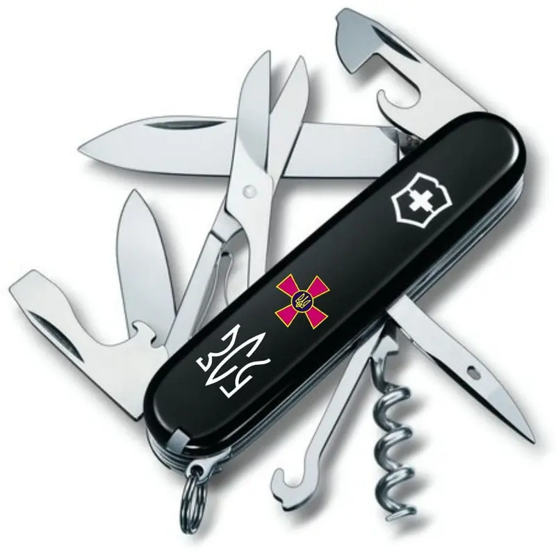 Швейцарський кишеньковий ніж 91 мм на 14 функцій з ексклюзивної лінійки CLIMBER ARMY. Чорні глянцеві накладки з ультрафіолетовим друком емблеми Збройних сил України та абревіатурою ЗСУ, стилізованою під Тризуб. Крута основа – чорні накладки, які були автентичними для перших складаних ножів Victorinox.