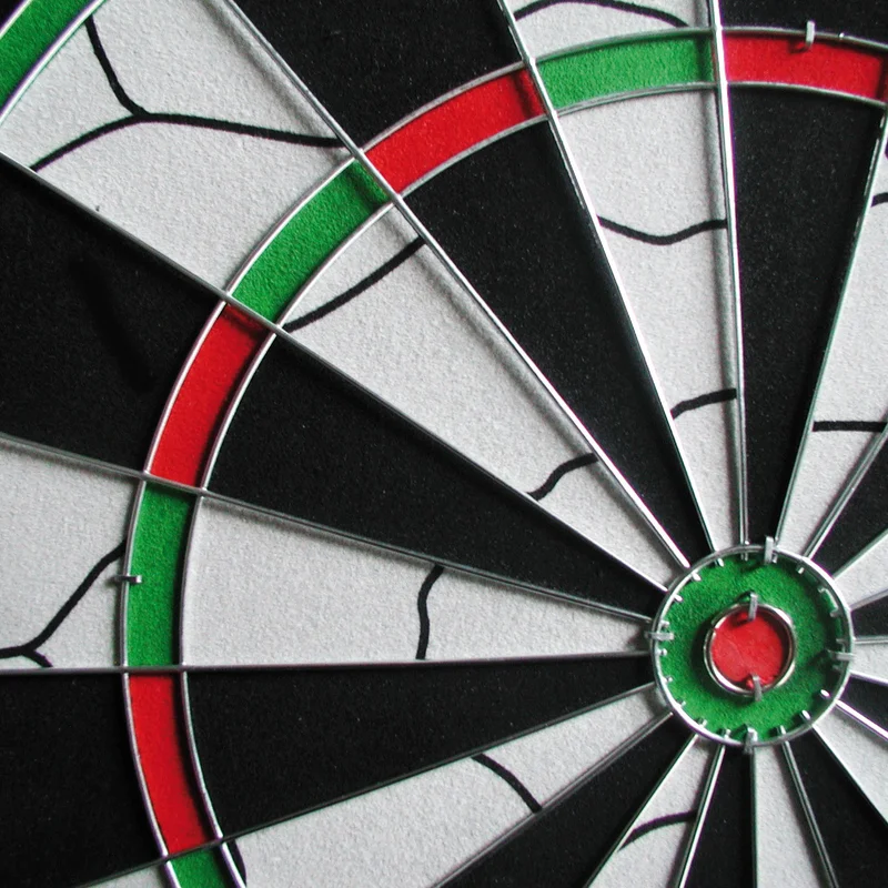 - Сторона 1: традиційна гра в дартс. Поділ на 20 секторів і 2 центри. Класичні кольори.