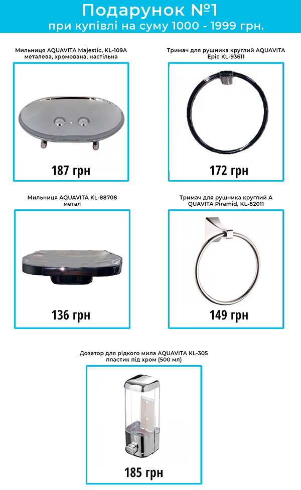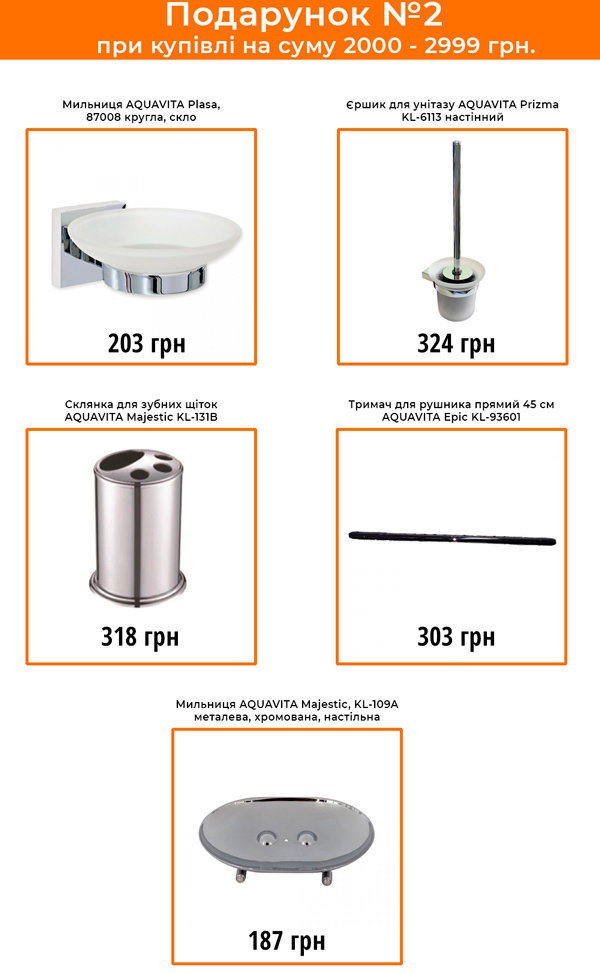 Не пропустіть цю чудову можливість перетворити свою ванну кімнату та отримати набір аксесуарів для ванни від Aquavita абсолютно безкоштовно! Акція обмежена за часом та кількістю подарунків, тож поспішайте зробити покупку сантехніки на суму від 1000 гривень та отримати свій подарунок вже сьогодні. Оновіть свою ванну кімнату з Aquavita та насолоджуйтеся комфортом і стилем щодня!
