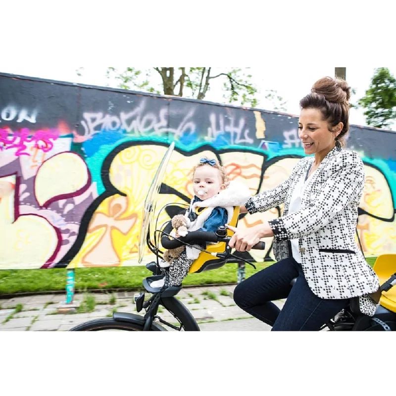 Дополнительный защитный экран из прозрачного поликарбоната, устанавливаемый спереди, защищает от брызг, грязи, камней и летящих мошек. Удачное расположение сиденья над передней осью гарантирует идеальное распределение нагрузки, практически не влияя на управляемость байком и выдерживает до 15 кг, что позволяет перевозить детей возрастом от 9 месяцев до 3 лет.
