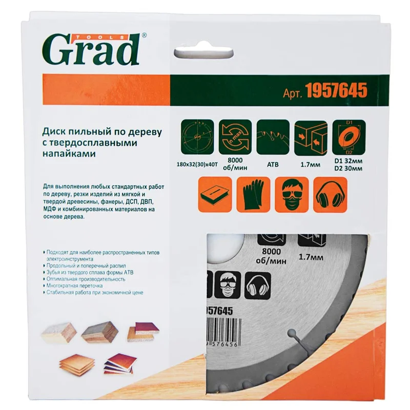 Диск пиляльний по дереву з твердосплавними напайками Ø180×32 (30)×40Т, 8000об/хв GRAD (1957645)