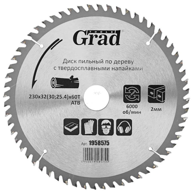 Диск пиляльний по дереву з твердосплавними напайками Ø230×32 (30; 25.4)×60Т, 6000об/хв GRAD (1958575)