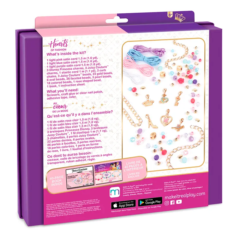 Два відомих бренди Disney Princess і Juicy Couture об'єдналися, щоб створити один приголомшливий набір для створення шарм-браслетів "Принцеси".Цей набір для рукоділля дозволяє дітям створити 6 стильних браслетів з підвісками від модного бренду Juicy Couture, а також Белль, Попелюшки і Жасмін. Діти можуть змішувати і поєднувати стилі, щоб створювати унікальні прикраси. До набору входять 3 шарми з зображенням принцес Діснея. Є скляна туфелька для Попелюшки, троянда для Белль і чарівна лампа для Жасмін. У наборі 3 підвіски Juicy Couture ™: ключик, корона і буква J з сердечком. Золоті та барвисті намистини, а також квіткові візерунки ідеально підходять для прихильниць принцес Діснея і Juicy Couture ™. У комплект входить спеціальний буклет із зображенням принцес Діснея та історії Juicy Couture ™, а також інструкція.До комплекту входять:- 1 світло-рожевий шнур довжиною 1,5 м- 1 блакитний шнур - 1,5 м- 1 світло-фіолетовий шнур довжиною 1,5 м- 3 шарми з принцесами Діснея- 3 підвіски Juicy Couture ™- 1 еластичний шнур - 1 м- 3 металеві ланцюжки- 3 намистини Juicy Couture ™- 22 золоті намистини- 6 намистин овальної форми- 26 гранованих намистин- 3 перламутрові намистини- 18 кольорових намистин- 2 намистини у формі троянди- 1 книга- 1 інструкція.Рекомендується для дітей від 8 років.