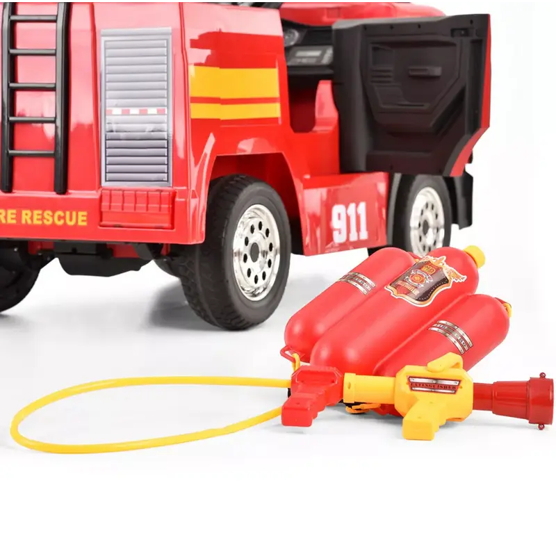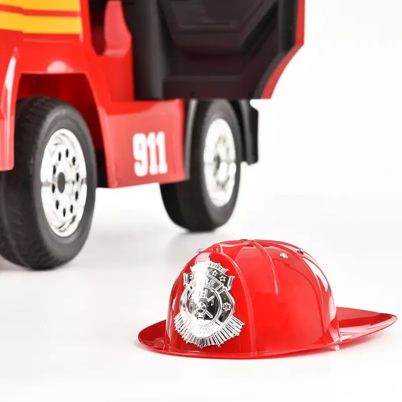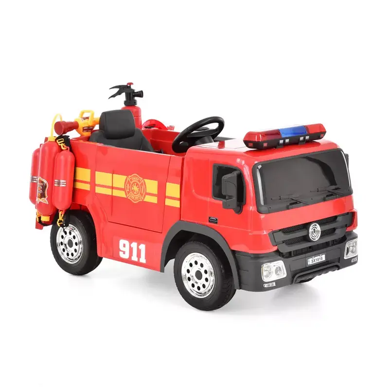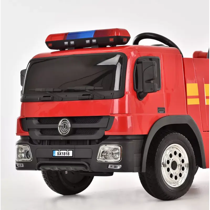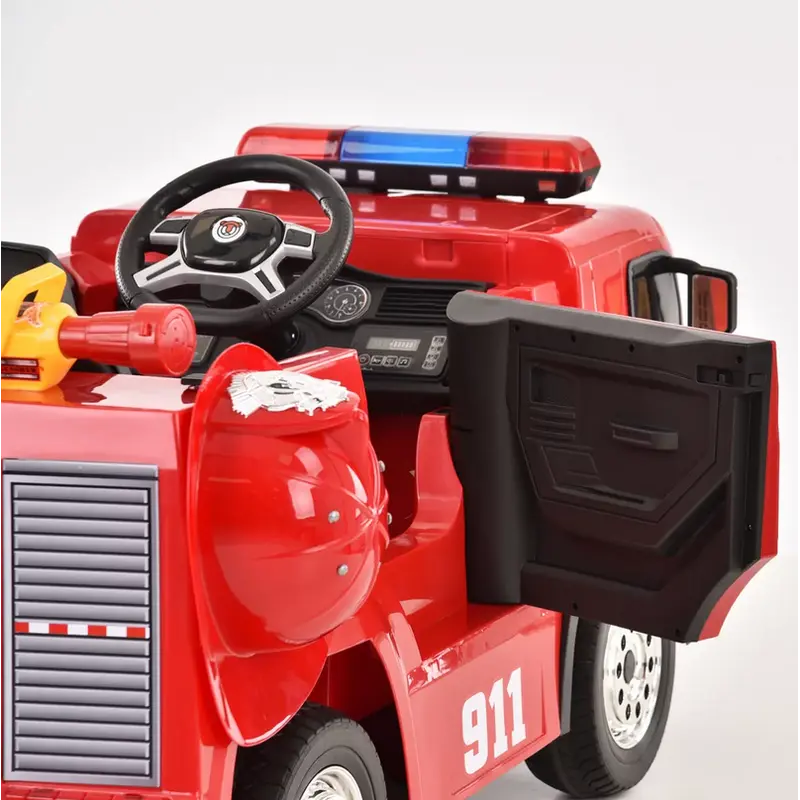 Дитячий пожежний автомобіль. MP3, USB, пульт дистанційного керування, максимальне навантаження 30 кг. Акумулятор 12 В / 10 Ач, двигуни 2 х 35 Вт. Для дітей від 3 до 8 років. Оснащений маячками, які блимають як справжні, Free fire шолом, вогнегасником зі шлангом.