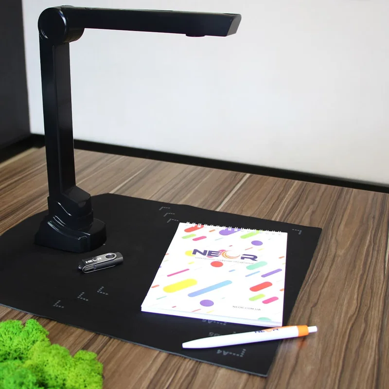 Документ-камера з функціями: автоматичного розпізнавання українського тексту, інтелектуальної розбивки по сторінках, зчитуванням QR-коду, функціями розпізнавання PDF, відео та OCR тощо. Програмне забезпечення на 17 мовах, в тому числі і українській. Дизайн Повністю пластмасовий корпус додатково полегшує конструкцію документ-камери, що дозволяє використовувати її, як презентер, навіть у місцях з мінімальною стійкістю, наприклад, паперові макети. Класичний чорний колір корпусу документ камери дозволяє використовувати її хоч нотаріусу, хоч кандидату наук. Функціональність Документ-камера А4 формату. Працює з файлами JPG, TIF, PDF, BMP, TGA, PCX, PNG, RAS, PDF, WORD, TXT. NEOR NW500 підтримує функцію запису відео якості 8 Мп. Отже, ви можете спостерігати за хімічними процесами, фізичними явищами просто для аудиторії і отримання якісного запису відео в форматах MP4, AVI. Вона має складну конструкцію і пластиковий корпус. Особливості Пластиковий корпус. Можна працювати з об’єктами не більше формату А4. LED підсвітка. Швидкість сканування 1 секунда. Живлення від USB комп’ютера. Функція запису відео. Спеціальний коврик у комплекті.