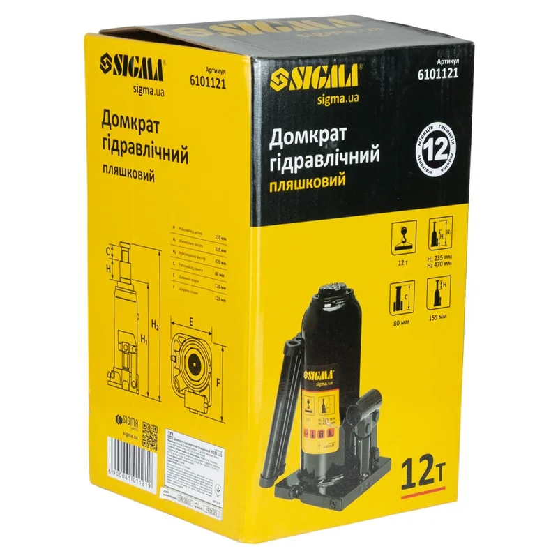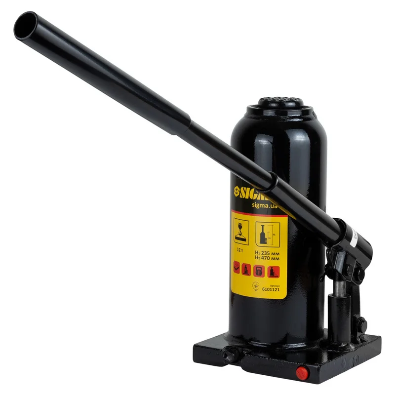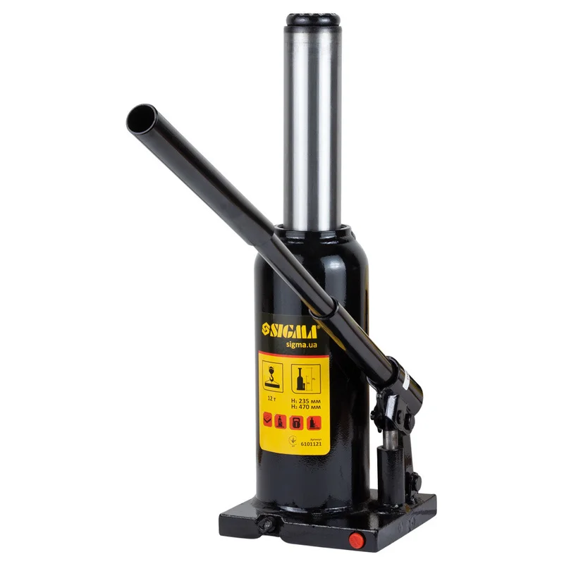 Домкрат гідравлічний пляшковий 12 т H 230-465 мм Sigma 6101121 Гідравлічний одноштоковый домкрат пляшкового типу (стовпчик) вантажопідйомністю 12 тонн від відомого виробника інструментів та обладнання SIGMA. Це надійний і компактний домкрат для універсального застосування і великих навантажень. У домкрата широка область застосування: він активно використовується при ремонті автомобілів, при підйомі всіляких вантажів, а також може використовуватися в якості силового вузла пресів, трубогибов, труборезов і іншого подібного обладнання. Гідравлічні домкрати SIGMA відрізняються надійністю, зручністю і простотою експлуатації. Вони мають міцну конструкцію і, незважаючи на компактні розміри, витримують інтенсивні навантаження. Ручний привід плунжера забезпечує плавний хід навіть при невеликому робочому зусиллі. Максимальна вантажопідйомність цієї моделі - 12 тонн. Висота підхоплення - 230 мм, максимальна висота підйому - 465 мм. Такі характеристики дозволяють працювати як з легковим транспортом, так і з вантажівками, сільськогосподарською технікою, мікроавтобусами, позашляховиками і різними важкими вантажами при ремонті та монтажі. Переваги та особливості моделі: Домкрати SIGMA сертифіковані за європейськими стандартами якості і безпеки. Міцна металева конструкція і плоска підстава забезпечують максимальну стійкість і надійність в роботі. Домкрат має плавний хід і забезпечує точну зупинку на заданій висоті при невеликому робочому зусиллі. Компактні розміри, простота експлуатації і тривалий термін служби. В комплект входить розбірна ручка-важіль, що складається з двох частин. Збоку є ручка для перенесення. Для підтримки домкрата в робочому стані рекомендується регулярно контролювати рівень масла і стежити за герметичністю сальників і клапанів. Пляшкові домкрати потрібно перевозити та зберігати у вертикальному положенні. Завдяки надійності, довговічності і простоті в роботі гідравлічні домкрати SIGMA користуються великою популярністю як у професіоналів, так і приватних майстрів та автовласників. Їх використовують на виробничих підприємствах, на будівництвах, автосервісах і шиномонтажах. А моделі з невеликою вантажопідйомністю стануть відмінним варіантом для заміни коліс або ремонту легкових автомобілів в майстернях та гаражах. Заходи безпеки при роботі з домкратами: Категорично забороняється піднімати вантаж, що важить більше, ніж зазначено в характеристиках домкрата. Домкрат під час роботи повинен стояти на рівній твердій поверхні, і встановлюватися під машиною у тих місцях, що рекомендуються виробником автомобіля і вказані в інструкції. Під колеса машини треба підставити противідкатні упори. Домкрати не рекомендується використовувати в якості утримуючого пристрою на тривалий час або для роботи під автомобілем. Для забезпечення безпеки треба додатково використовувати підставки під машину.