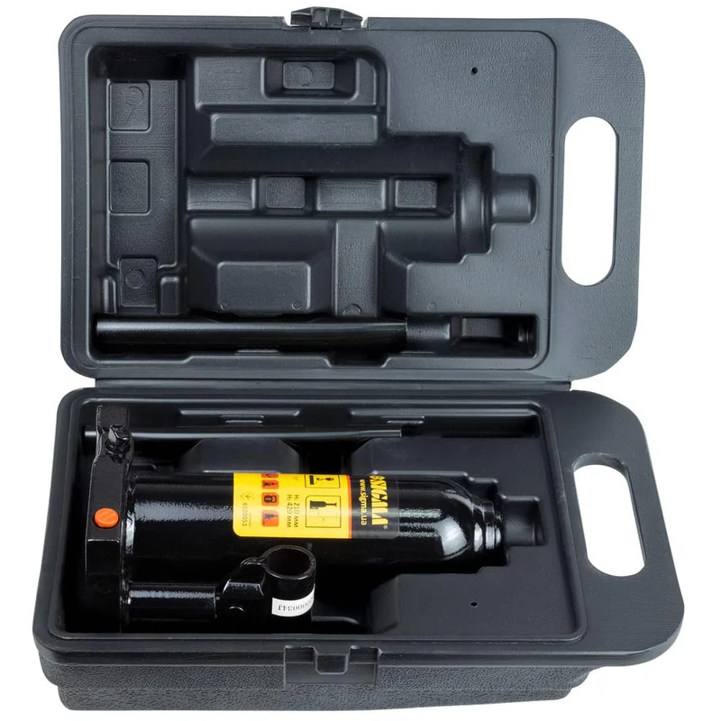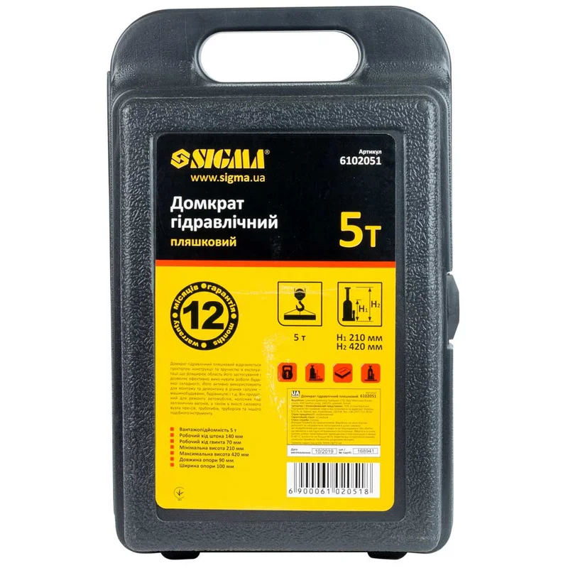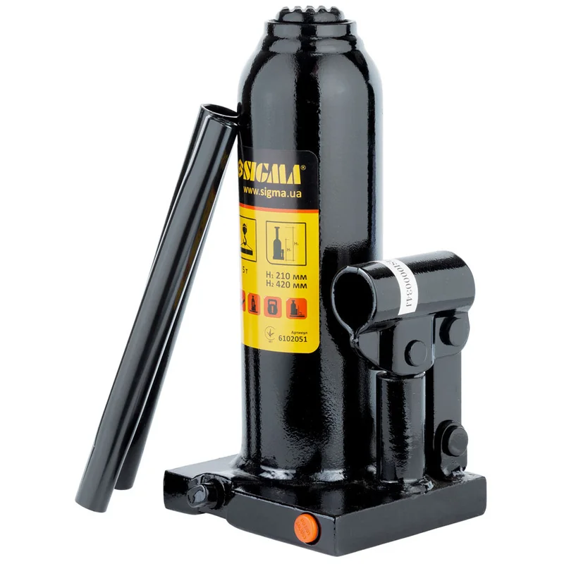 Домкрат гідравлічний пляшковий 5 т H 216-413 мм (кейс) Sigma 6102051 Надійний і зручний в роботі гідравлічний пляшковий домкрат вантажопідйомністю 5 тонн в міцному пластиковому кейсі від відомого виробника інструментів та обладнання SIGMA. Це надійний домкрат для універсального застосування як на СТО, так і в побуті. У домкрата невелика вага і компактні розміри, і він не займе багато місця на полиці в майстерні чи в багажнику автомобіля. У домкрата широка область застосування: він активно використовується при ремонті автомобілів, при підйомі всіляких вантажів, а також може використовуватися в якості силового вузла пресів, трубогибов, труборезов і іншого подібного обладнання. Гідравлічні домкрати SIGMA відрізняються надійністю, зручністю і простотою експлуатації. Вони мають міцну конструкцію і, незважаючи на компактні розміри, витримують інтенсивні навантаження. Ручний привід плунжера забезпечує плавний хід навіть при невеликому робочому зусиллі. Максимальна вантажопідйомність цієї моделі - 5 тонн. Висота підхоплення - 216 мм, а максимальна висота підйому - 413 мм. Такі характеристики дозволяють працювати з усіма легковими автомобілями позашляховиками, мікроавтобусами і різними вантажами при ремонтних і монтажних роботах. Переваги та особливості моделі: Домкрати SIGMA сертифіковані за європейськими стандартами якості і безпеки. Міцна металева конструкція і плоска підстава забезпечують максимальну стійкість і надійність в роботі. Домкрат має плавний хід і забезпечує точну зупинку на заданій висоті при невеликому робочому зусиллі. Компактні розміри, простота експлуатації і тривалий термін служби. В комплект входить розбірна ручка-важіль, що складається з двох частин. У комплекті з домкратом йде міцний пластиковий кейс, в якому зручно зберігати і перевозити інструмент. Для підтримки домкрата в робочому стані рекомендується регулярно контролювати рівень масла і стежити за герметичністю сальників і клапанів. Пляшкові домкрати потрібно перевозити та зберігати у вертикальному положенні. Завдяки надійності, довговічності і простоті в роботі гідравлічні домкрати SIGMA користуються великою популярністю як у професіоналів, так і приватних майстрів та автовласників. Їх використовують на виробничих підприємствах, на будівництвах, автосервісах і шиномонтажах. А моделі з невеликою вантажопідйомністю стануть відмінним варіантом для заміни коліс або ремонту легкових автомобілів в майстернях та гаражах. Заходи безпеки при роботі з домкратами: Категорично забороняється піднімати вантаж, що важить більше, ніж зазначено в характеристиках домкрата. Домкрат під час роботи повинен стояти на рівній твердій поверхні, і встановлюватися під машиною у тих місцях, що рекомендуються виробником автомобіля і вказані в інструкції. Під колеса машини треба підставити противідкатні упори. Домкрати не рекомендується використовувати в якості утримуючого пристрою на тривалий час або для роботи під автомобілем. Для забезпечення безпеки треба додатково використовувати підставки під машину.