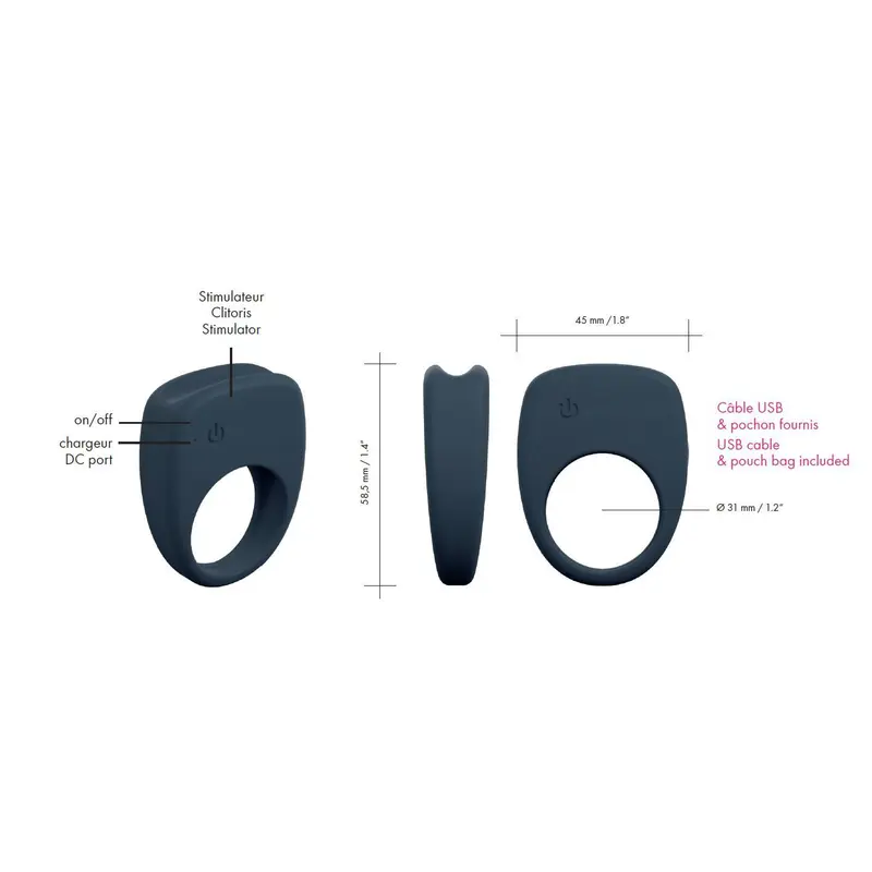Рекомендації щодо використання: для максимального комфорту під час надягання використовуйте лубрикант на водній основі. Слідкуйте за технікою безпеки та не носіть кільце довше 30 хвилин поспіль. Для очищення використовуйте теплу воду з милом та спеціальний очисник для секс-іграшок. Тримайте окремо від інших іграшок. Атласний мішечок для зберігання входить до комплекту.