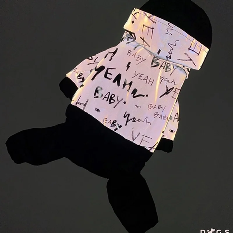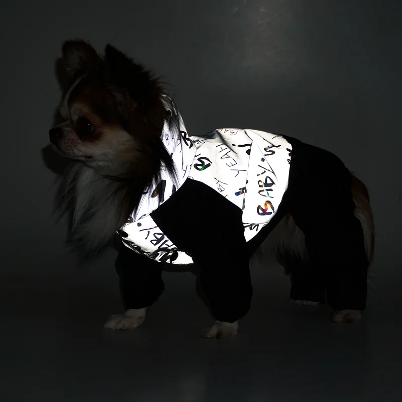 тканина світловідбиваюча та водовідштовхувальна плащівка комбінезон світиться при направленні на нього будь-якого світла кращий вибір для безпечних прогулянок ввечері, собаку видно на дорозі підклад з водооталкивающая плащової тканини на шиї отвір для повідця застібається кнопками на животі модель унісекс