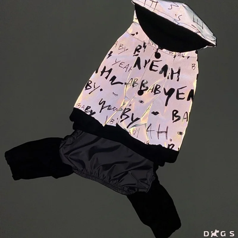 тканина світловідбиваюча та водовідштовхувальна плащівка комбінезон світиться при направленні на нього будь-якого світла кращий вибір для безпечних прогулянок ввечері, собаку видно на дорозі підклад з водооталкивающая плащової тканини на шиї отвір для повідця застібається кнопками на животі модель унісекс