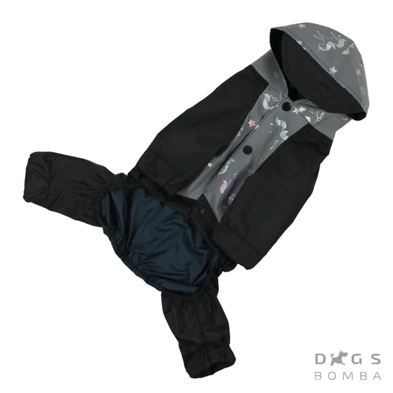 тканина світловідбиваюча та водовідштовхувальна плащівка комбінезон світиться при направленні на нього будь-якого світла кращий вибір для безпечних прогулянок ввечері, собаку видно на дорозі підклад з водооталкивающая плащової тканини на шиї отвір для повідця застібається кнопками на животі модель унісекс