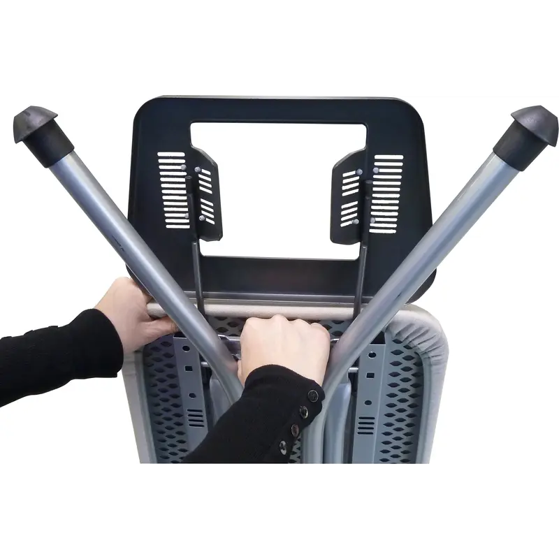 Дошка для прасування Rolser K-22 Blanco/Negro (K06015-2064) - якісний продукт з сучасним дизайном та широким функціоналом. Перфорована основа робочої поверхні запобігає утворенню конденсату. Більш ефективне прасування забезпечується тришаровим бавовняним чохлом, який відбиває тепло та пар. Підставка під праску стійка до високих температур. Модель регулюється по висоті в десятьох положеннях і обладнана автоматичним фіксатором. Трубчасті ніжки надають конструкції стійкості та легко кріпляться до дошки в складеному стані, що унеможливлює її випадкове відкриття.