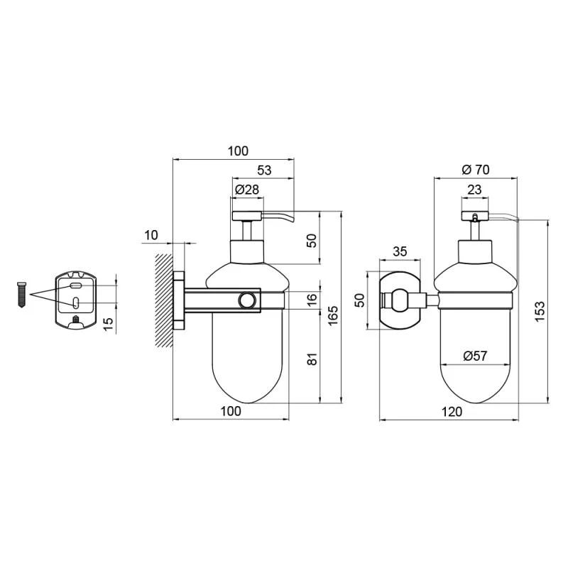 Дозатор для мила Qtap Liberty CRM 1152 робить процес миття рук гігієнічним і швидким. Латунний тримач дозатора у вигляді кронштейна з кільцем має антикорозійні властивості та кріпиться на стіну. Пляшка виконана з матового скла. Дизайн дозатора підходить за дизайном до будь-яких аксесуарів, чудово доповнить невеликі санвузли і, завдяки своїм розмірам, може кріпитися в будь-якому зручному та доступному місці. Не займає місце на раковині.