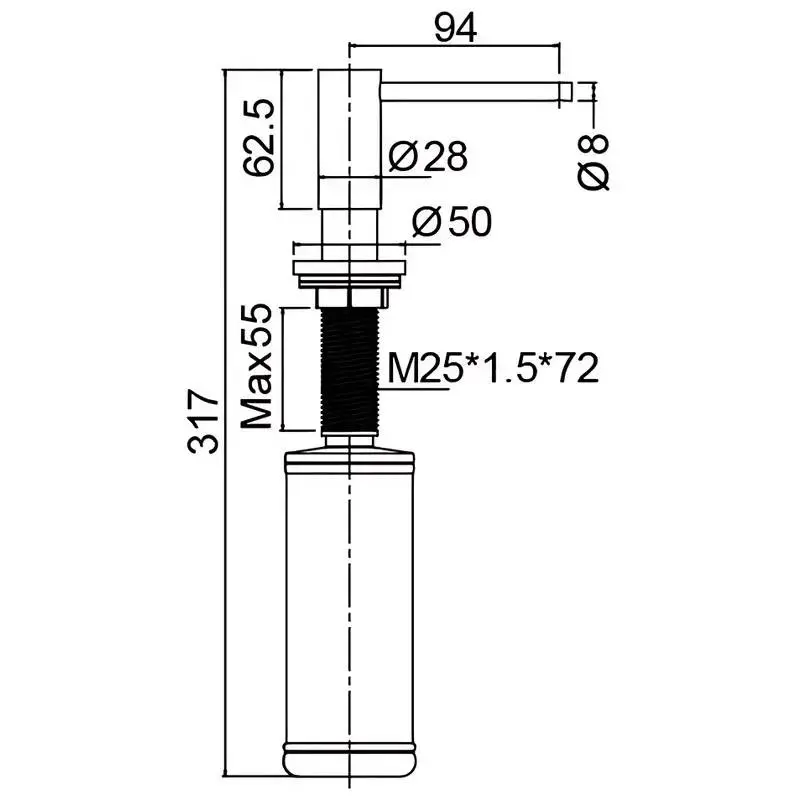 Дозатор має систему верхнього наповнення: щоб долити мийний засіб, достатньо підняти помпу - колбу під стільницею знімати не потрібно. Корпус з нержавіючої сталі стійкий до корозії та пошкоджень, а колба з ABS-пластику розрахована на щоденне використання і проста в очищенні.