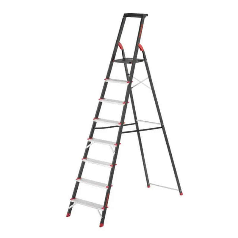 Драбина визготовлена з міцного сталевого профілю з алюмінієвими сходинками. Рифлені сходинки не дадуть зісковзнути нозі і гарантують безпечний підйом, а також зручне положення під час роботи. Драбина відповідає європейському стандарту EN131 і витримує навантаження до 150 кг.
