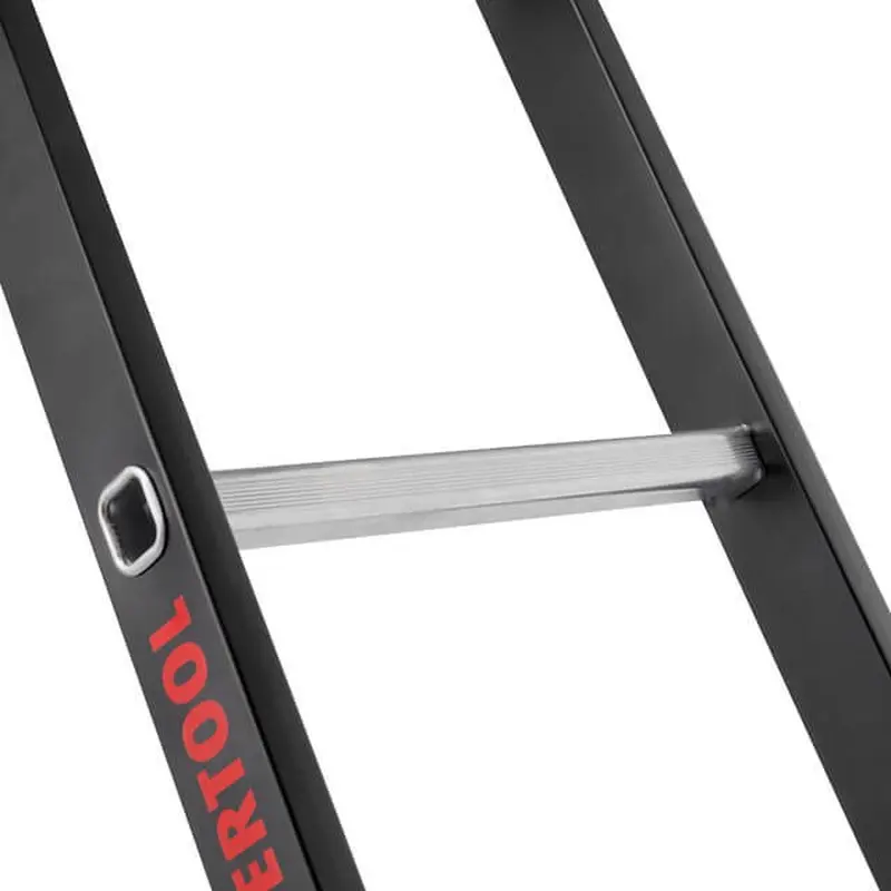 Сталевий профіль забезпечує жорскість конструкції, а також здатність витримати навантаження до 150 кг. Драбина стійка і не ковзає на будь-яких поверхнях завдяки надійним еластичним пластиковим ніжкам. Рифлені сходинки не дадуть нозі зісковзнути під час роботи.