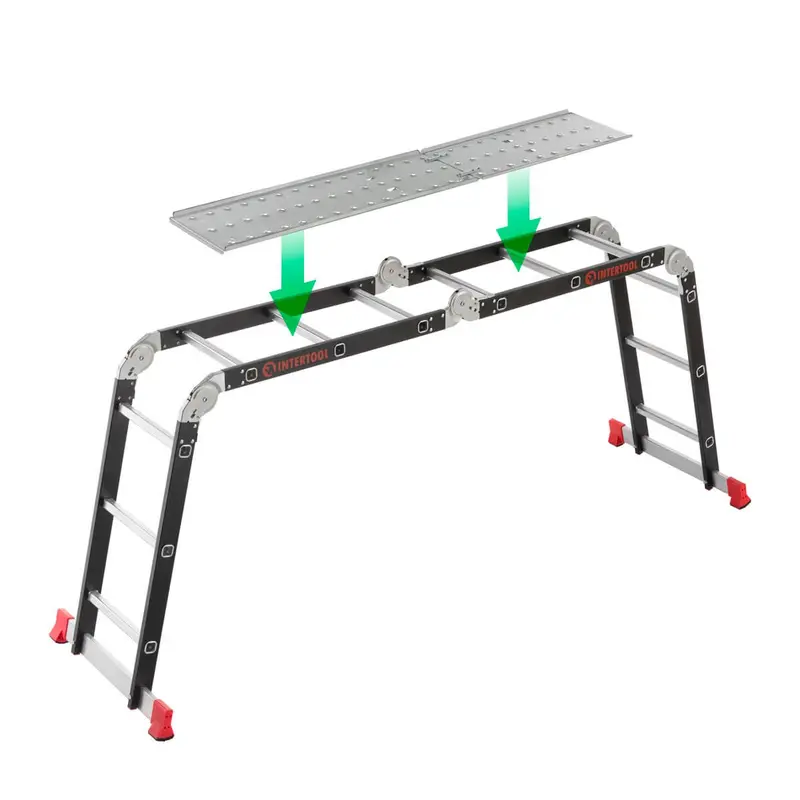 Функціональність драбини може бути розширена за допомогою додаткової сходинки-полиці з вантажопідйомністю до 150 кг і платформи LT-6023, по якій ви зможете вільно пересуватися під час виконання робіт.