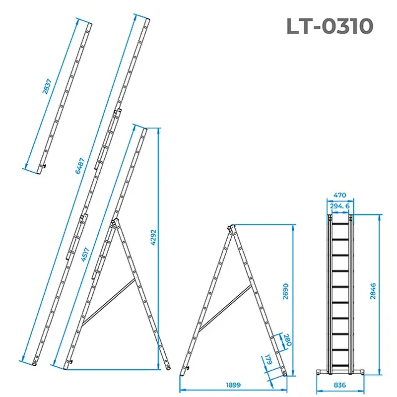 Алюмінієві сходи LT-0310 виготовлені з надміцного, легкого, стійкого до корозії алюмінієвого профілю. Вони стійкі та не ковзають по будь-яких поверхнях завдяки надійним пластиковим ніжкам, що також захищають меблі й підлогу від вм'ятин та подряпин. Рифлені сходинки не дадуть нозі зісковзнути під час роботи. Модель розрахована на тривалий строк експлуатації та відповідає європейському стандарту якості EN 131.