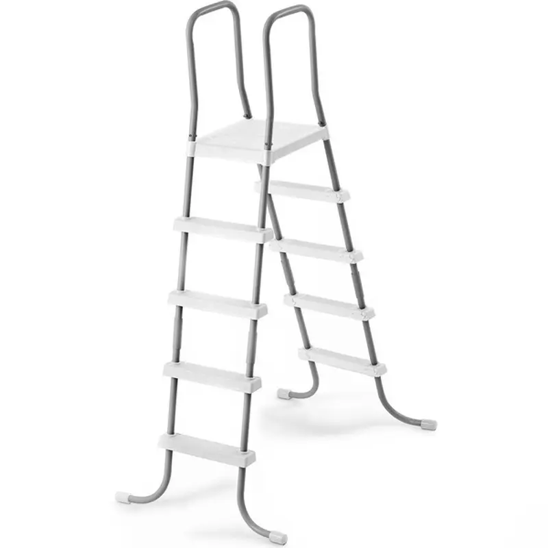 Металева драбина 58337. Допоможе зі зручністю входити в басейн і виходити з нього. Оснащена майданчиком. Основа виготовлена з якісного металу з антикорозійним напиленням. Сходи та майданчик - міцний пластик із захистом від УФ. Розбірна конструкція зручна для перевезення. Підходить до будь-яких наземних басейнів висотою до 132 см.