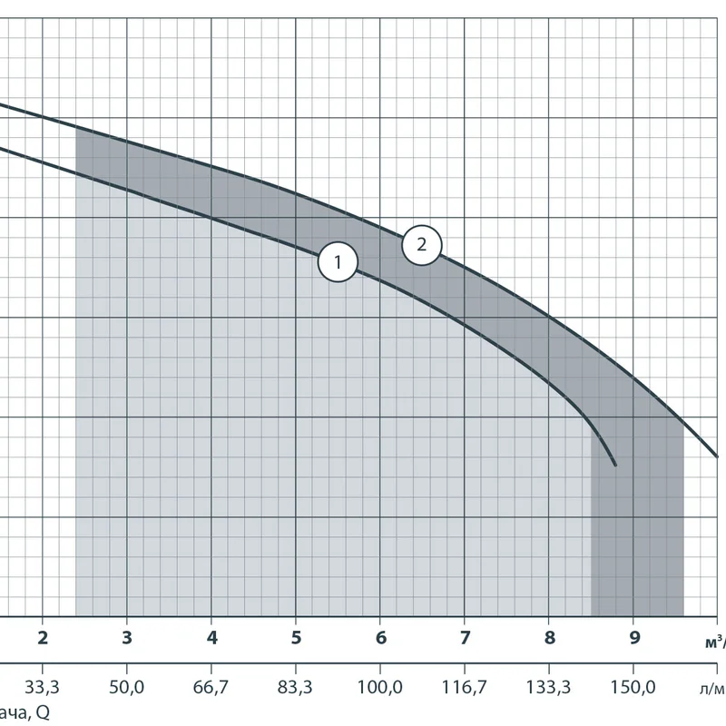 - Максимальная объемная подача: 9 м³/ч (150 л/мин)
