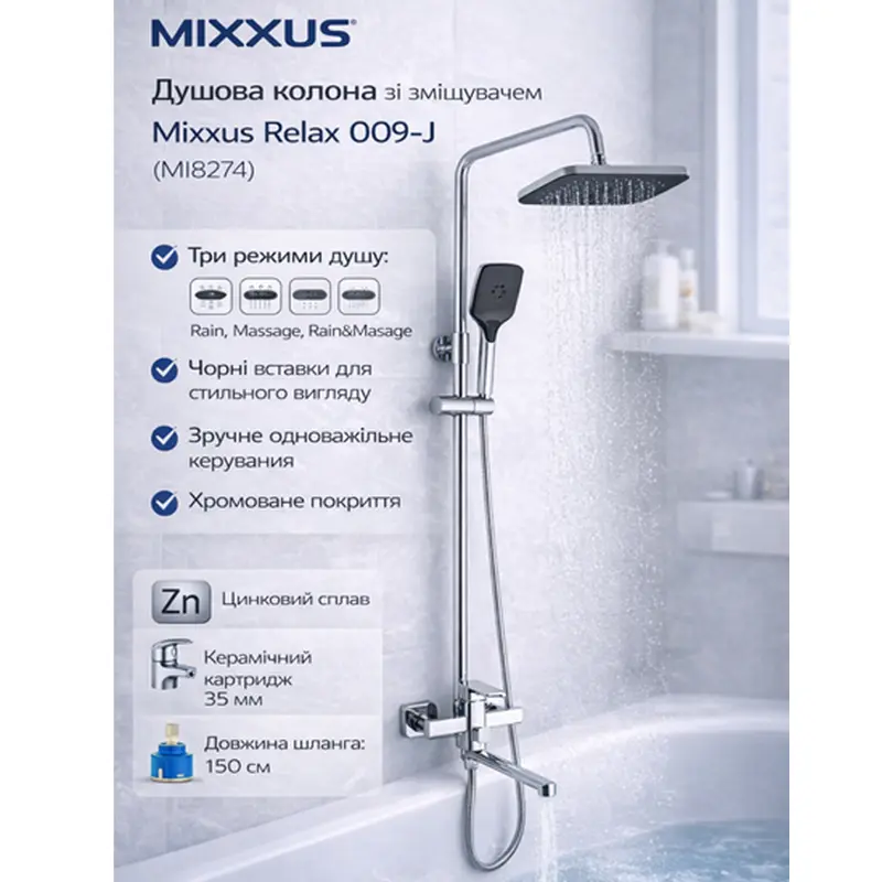 Mixxus Relax 009-J (MI8274) — це поєднання німецької ідеї дизайну, практичності та комфорту, яке зробить кожен душ приємним і розслаблюючим