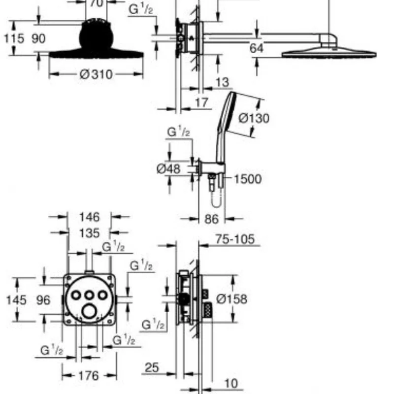 Комплектація: У комплект входять: термостат прихованого монтажу на 3 виходи, універсальна вбудована частина, верхній душ, душовий кронштейн 430 мм і ручний душ, 3 режими струменя, підключення для душового шланга з тримачем, душовий шланг Silverflex 1500 мм, TwistStop. Для ручного душу передбачено додатковий регулятор витрати 9,5 л/хв.