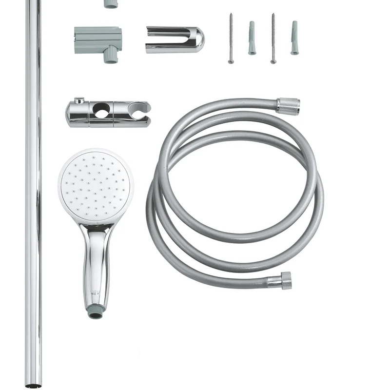 Душевая штанга с кронштейном для лейки (27523000), лейка для ручного душа (27852000), душевой шланг (28154000), крепежи.