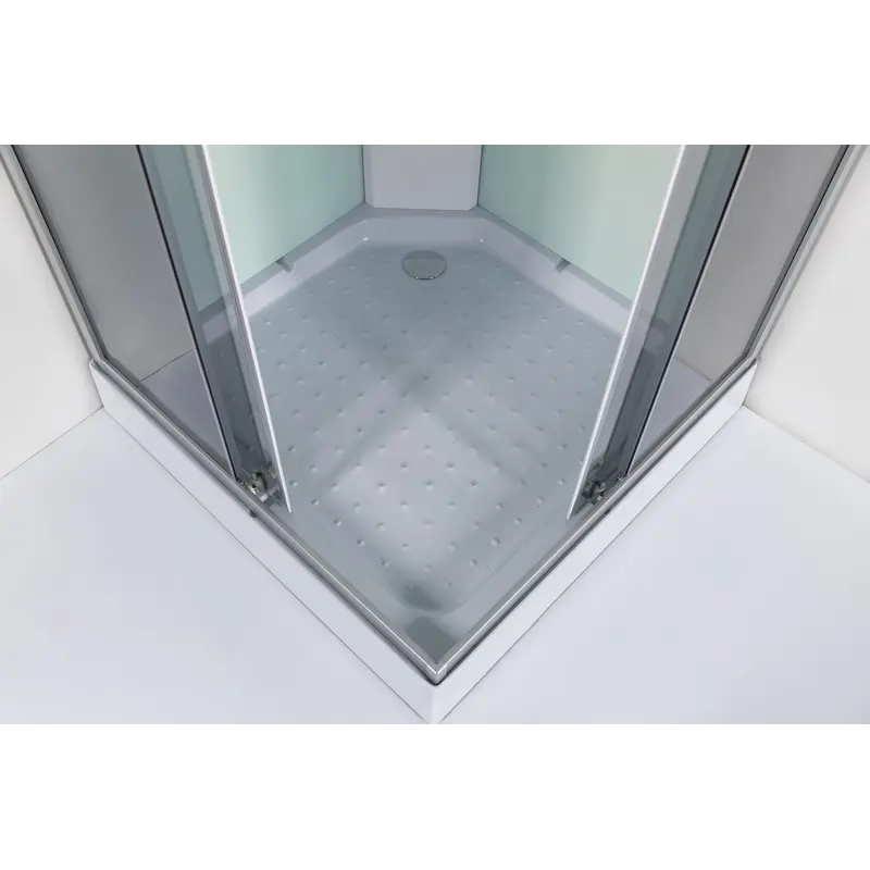 Душовий бокс Poli - HL Розміри: 90×90×215 см Піддон: Мілкий (низький) - 14 см, що сприяє ергономічному входу та безпечному використанню. Профіль: Алюмінієвий сірий профіль забезпечує міцність конструкції та сучасний вигляд. Склові панелі: Переднє скло - 5 мм, тоноване для естетики та приватності. Заднє скло - 4 мм, біле, для додаткової яскравості. Змішувач: Хромований, 2-х режимний - забезпечує можливість використання як верхнього душа , так і хромованої ручної душ лійки (без форсунок), що дозволяє ефективно розподіляти потік води. Додаткове оснащення: Пластикові хромовані ручки, що забезпечують надійність і зручність. Вбудована поличка для аксесуарів чи косметики. Сучасна система дренажу, яка сприяє швидкому стоку води та легкому обслуговуванню конструкції. Цей душовий бокс поєднує в собі сучасність, функціональність та естетичний дизайн, що робить його ідеальним вибором для стильних ванних кімнат. Він не має електронних компонентів, що забезпечує простоту експлуатації та надійність у використанні, а також спрощує монтаж і обслуговування.