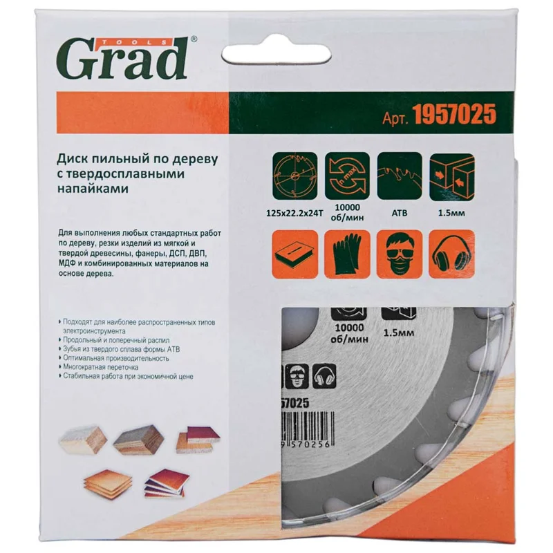 Диск пиляльний по дереву з твердосплавними напайками Ø125×22.2×24Т, 10000об/хв GRAD (1957025) призначений для виконання будь-яких стандартних робіт по дереву, різання виробів з м'якої і твердої деревини, фанери, ДСП, ДВП, МДФ і комбінованих матеріалів на основі дерева. Додатковою перевагою є можливість заміни і заточування зуба.