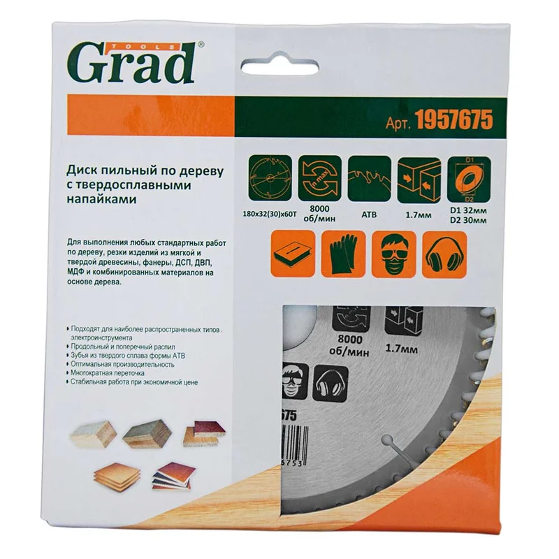 Диск пиляльний по дереву з твердосплавними напайками Ø180×32 (30)×60Т, 8000об/хв GRAD (1957675) призначений для виконання будь-яких стандартних робіт по дереву, різання виробів з м'якої і твердої деревини, фанери, ДСП, ДВП, МДФ і комбінованих матеріалів на основі дерева. Додатковою перевагою є можливість заміни і заточування зуба.