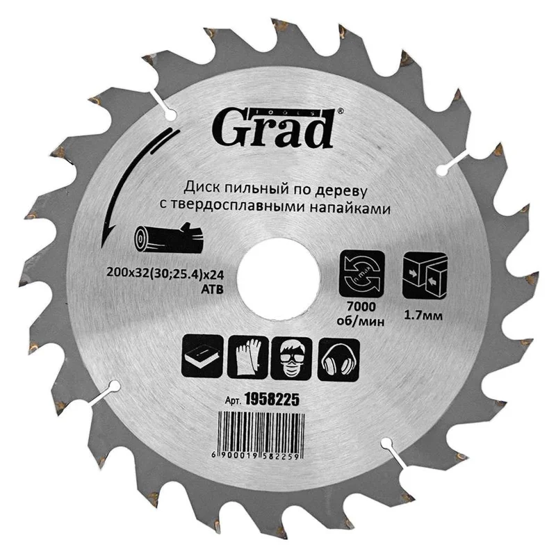 Диск пиляльний по дереву з твердосплавними напайками Ø200×32 (30; 25.4)×24Т, 7000об/хв GRAD (1958225)
