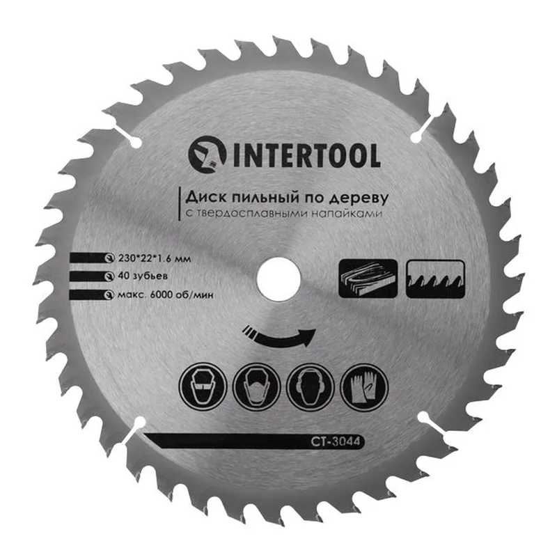 Диск пиляльний по деревині з твердосплавними напайками 230*22*1.6 мм, 40 зубів INTERTOOL CT-3044