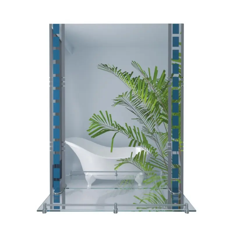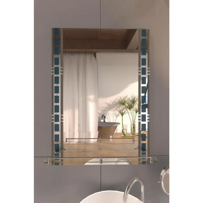 Дзеркало Lidz 140.07.06 з полицею 500х700х105 кріпиться на стіну за допомогою шурупів, які входять до комплекту. Воно комплектується разом з полицею 477х100 мм з прозорого скла з хромованим бортиком, що запобігає випадковому падінню гігієнічних засобів. Полиця кріпиться до дзеркала за допомогою металевих тримачів. Хромована поверхня захищає від вологи та зберігає блиск надовго. По краям дзеркало декоровано сірими та синіми смужками.