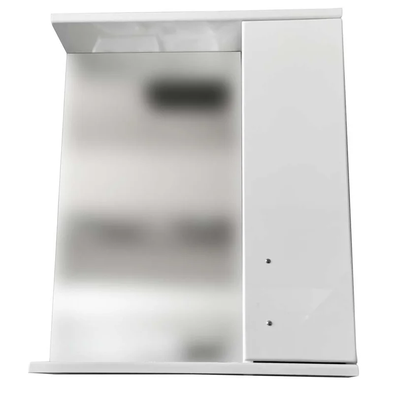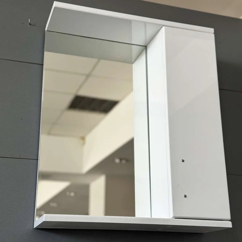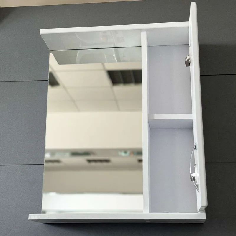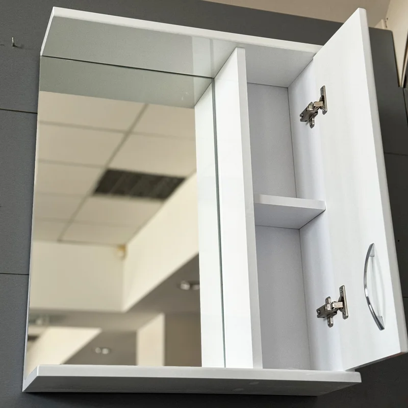 Дзеркало з шафкою. Закрита шухляда з одного боку і полиця на всю ширину дзеркала. підсвічування і розетка. Корпус виконаний з ДСП з двосторонньою ламінацією білого кольору, товщина 16 мм. Фасади з MDF з двосторонньою ламінацією, товщина 16 мм. Фасади і зовнішні поверхні пофарбовані емаллю.